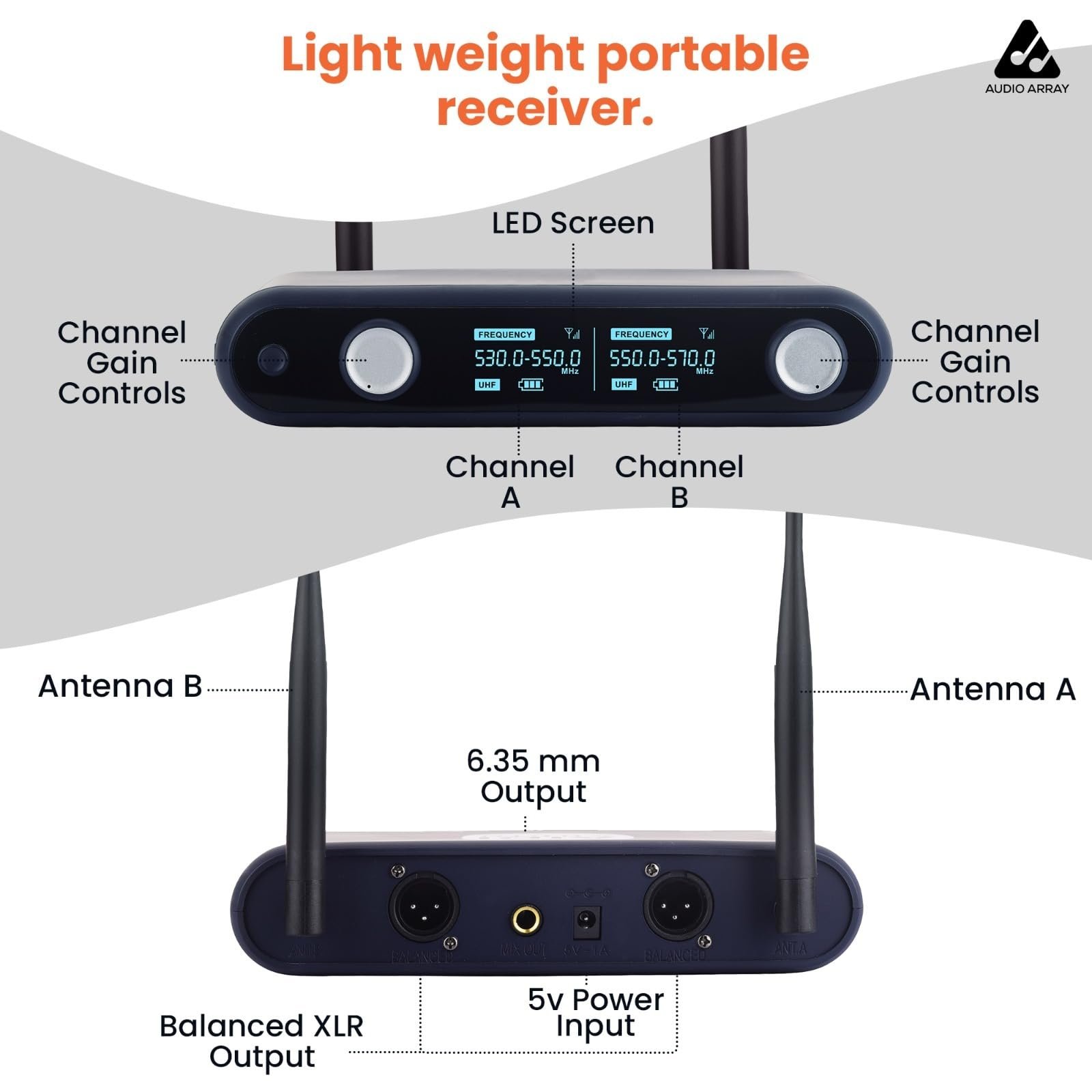 - 📦 [What’s Included]: 1 x Portable Receiver 2 x Handheld Transmitters 4 x AA batteries 1 x 1/4″ Output Cable 2 x Anti-Rolling Silicone Rings 1x Power adapter 1x User Manual