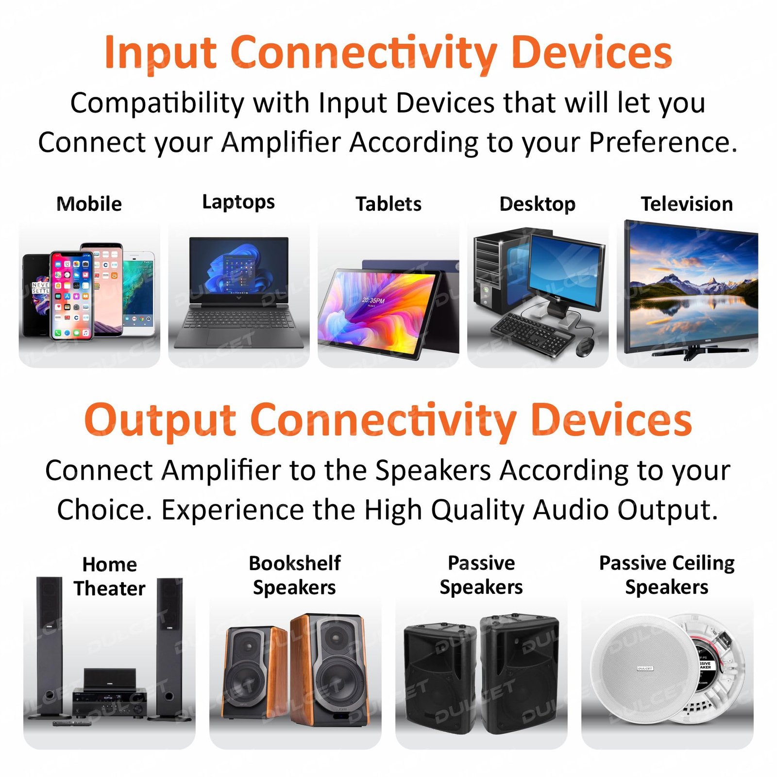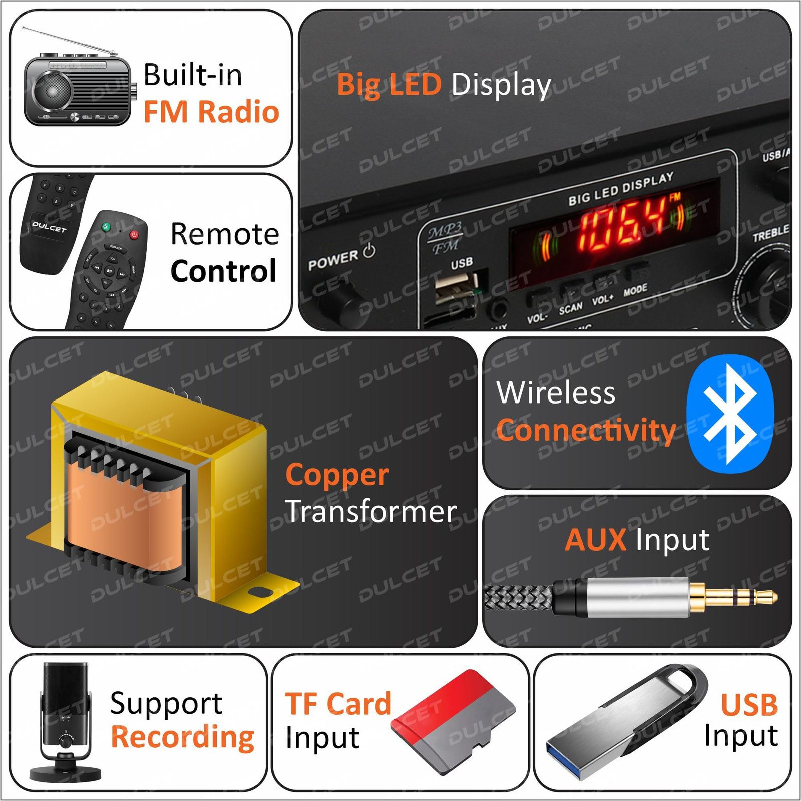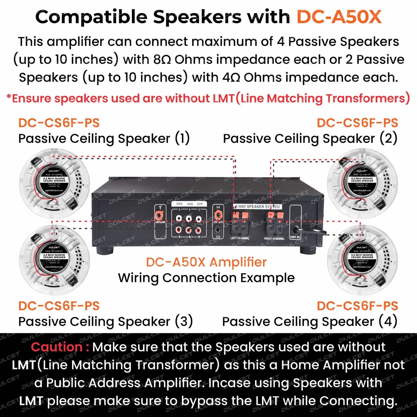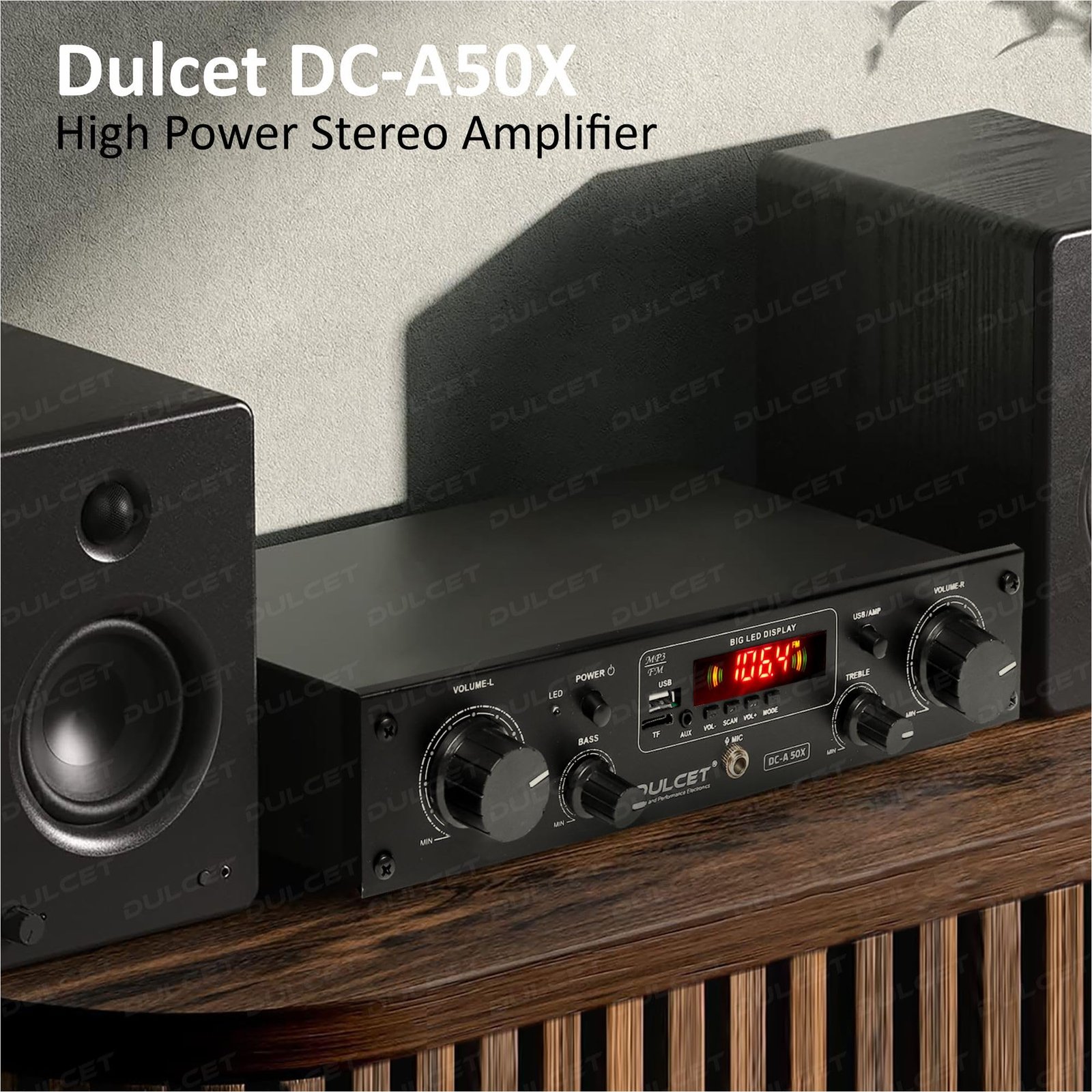 - BUILT TO CONNECT: Enhance your Entertainment Experience with DC-A50X High Power Amplifier that supports various external sources inputs like FM, USB, AUX, SD Card and Built-in bluetooth that offers a wide range of Bluetooth enabled devices compatibility the 6 RCA Socket enables you to easily connect it with DVD, TV, Home Theater or Laptops. Also, you can easily connect 4 Speakers/Woofers of 8 to 10 inches each with 4/8 Ohms that makes it a perfect choice for all your entertainment need