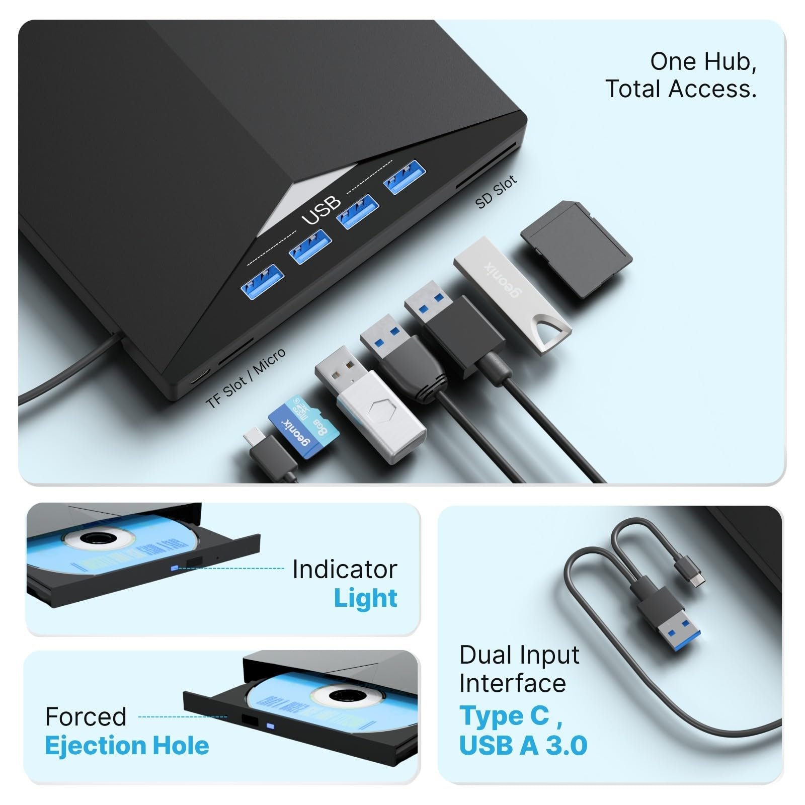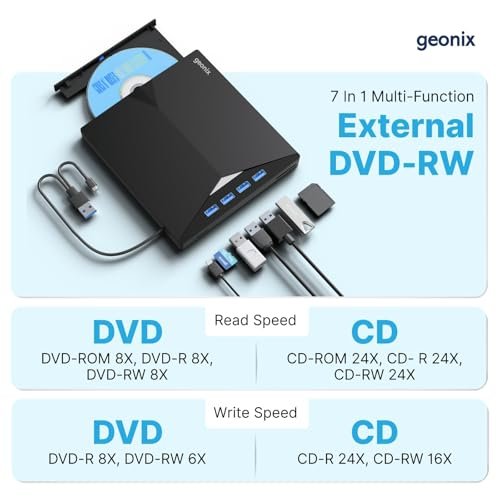 - 7 IN 1 Optical Drive Our portable DVD player is not only a CD/DVD reader, but also a CD/DVD burner/burner, 4 port USB 3.0 hub, SD card reader, TF card reader
