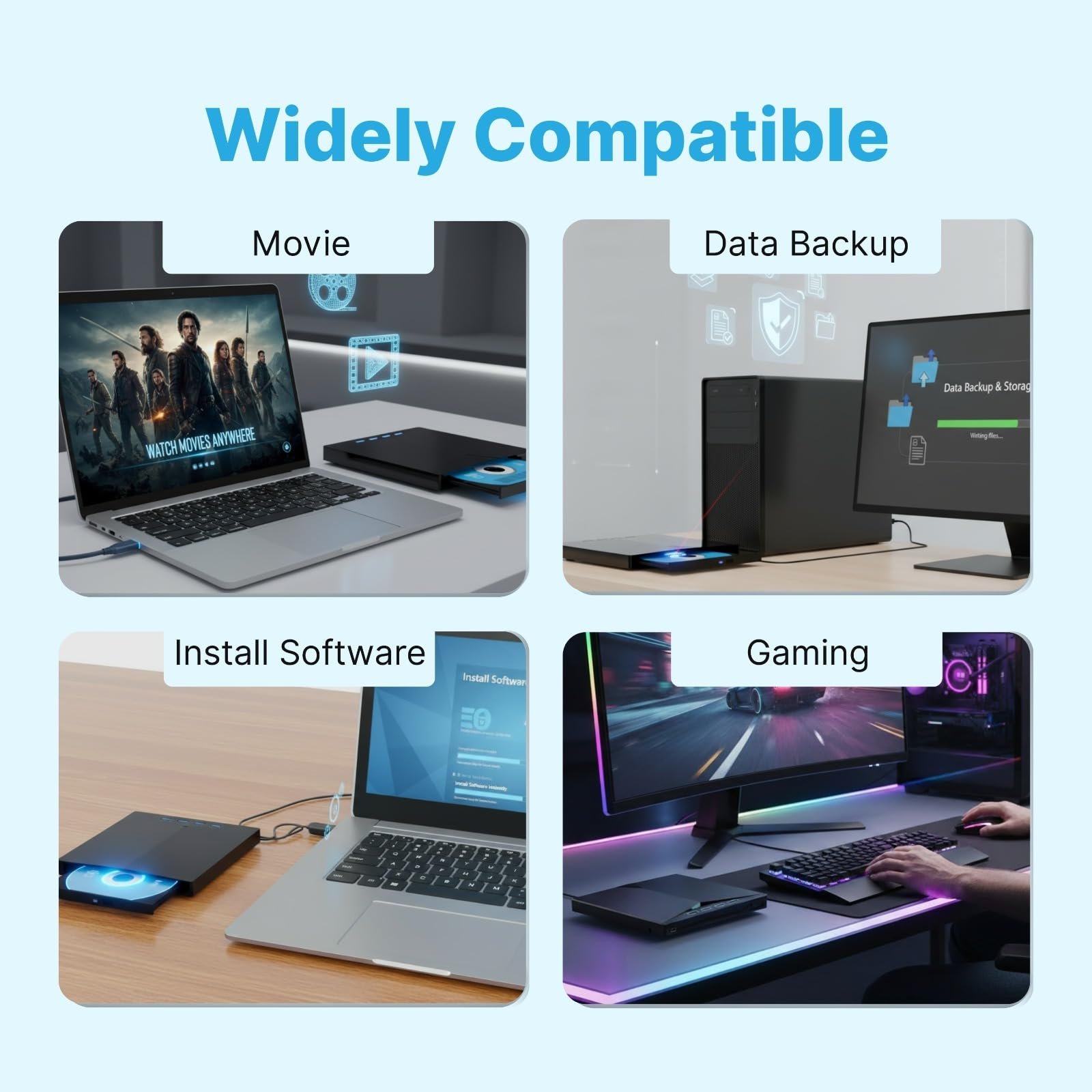 - Our USB DVD drive is compatible with Windows 11/10/8/7, Linux, Mac OS and other systems. You can use this External DVD Drive for laptop to listen to music, watch movies, play games, burn data and install Software etc.