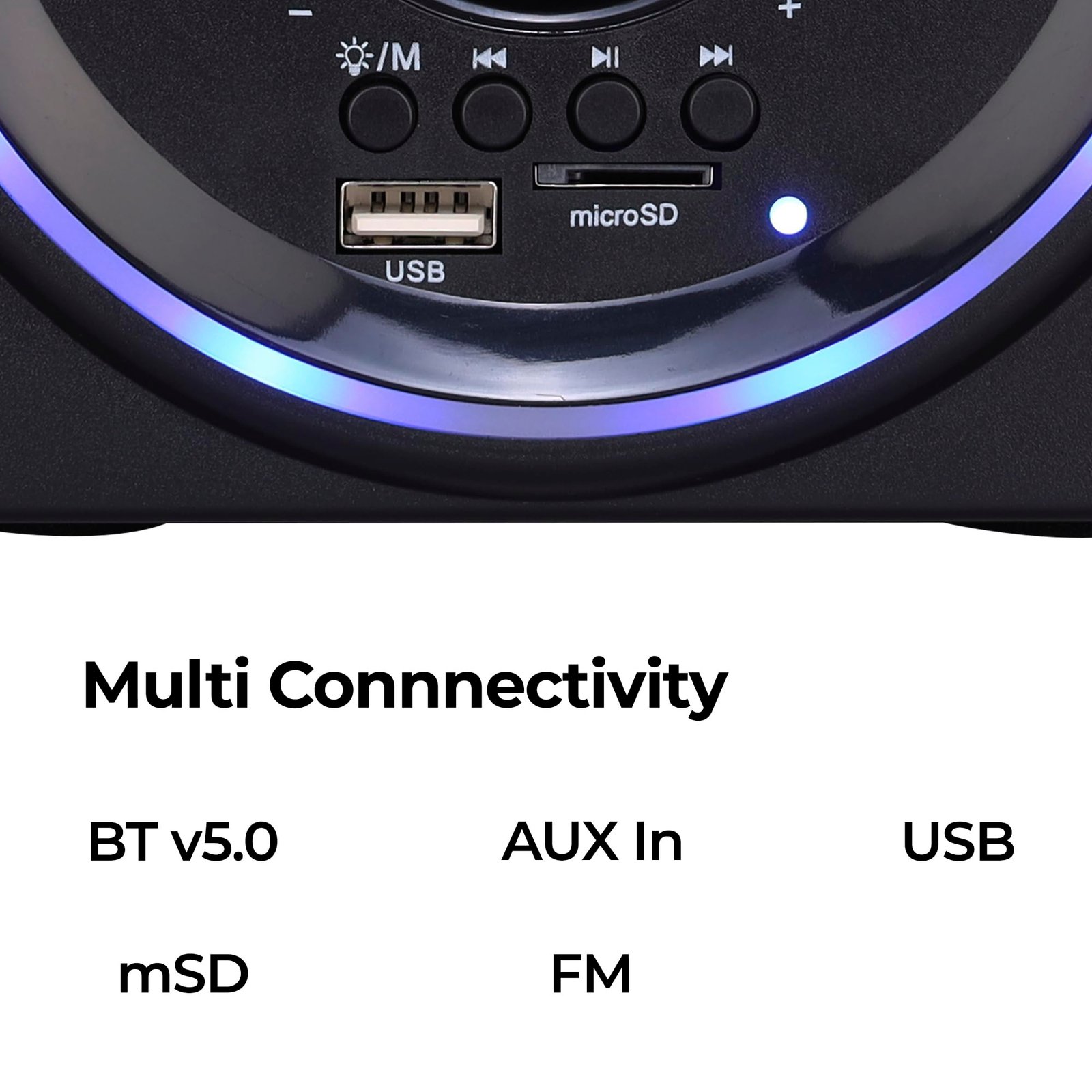 - For seamless connectivity, the speaker allows you to connect with other devices wirelessly via BT v5.0 offering a wider connection range and for devices that demand a wired connection, the speaker allows for AUX apart from USB, and mSD ports. Play your favorite radio with the FM connection supported by the speaker