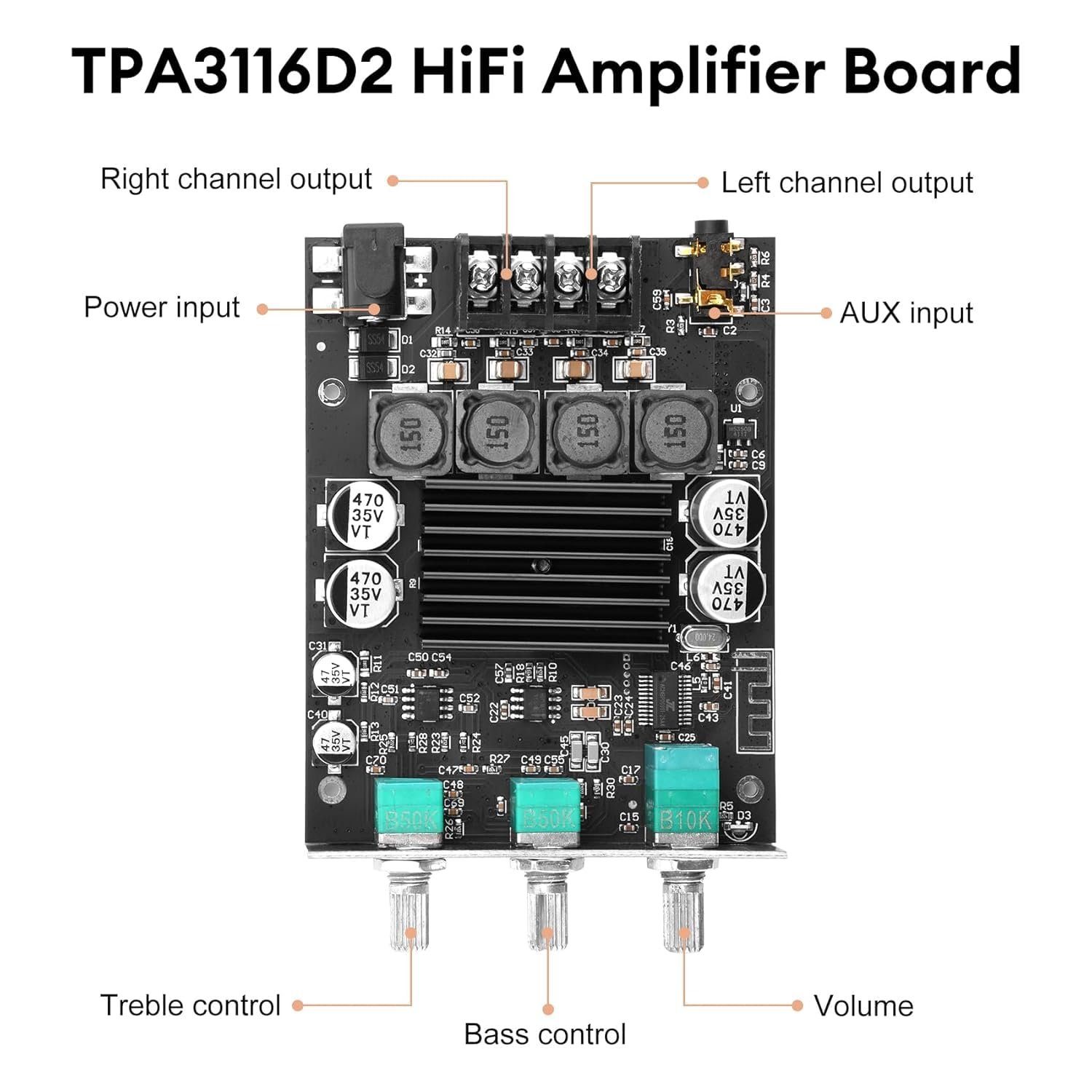 • šŸ”Š High-Power Stereo Output – 2Ɨ100W: Based on the powerful TPA3116D2 chip, this Class D amplifier delivers 100W per channel for high-fidelity sound, perfect for full-range speaker systems and home audio setups.